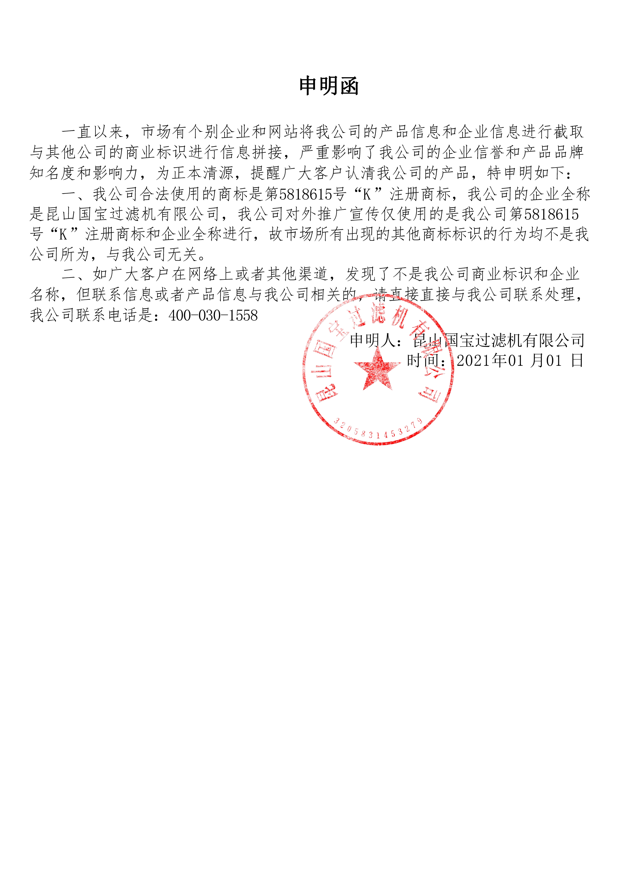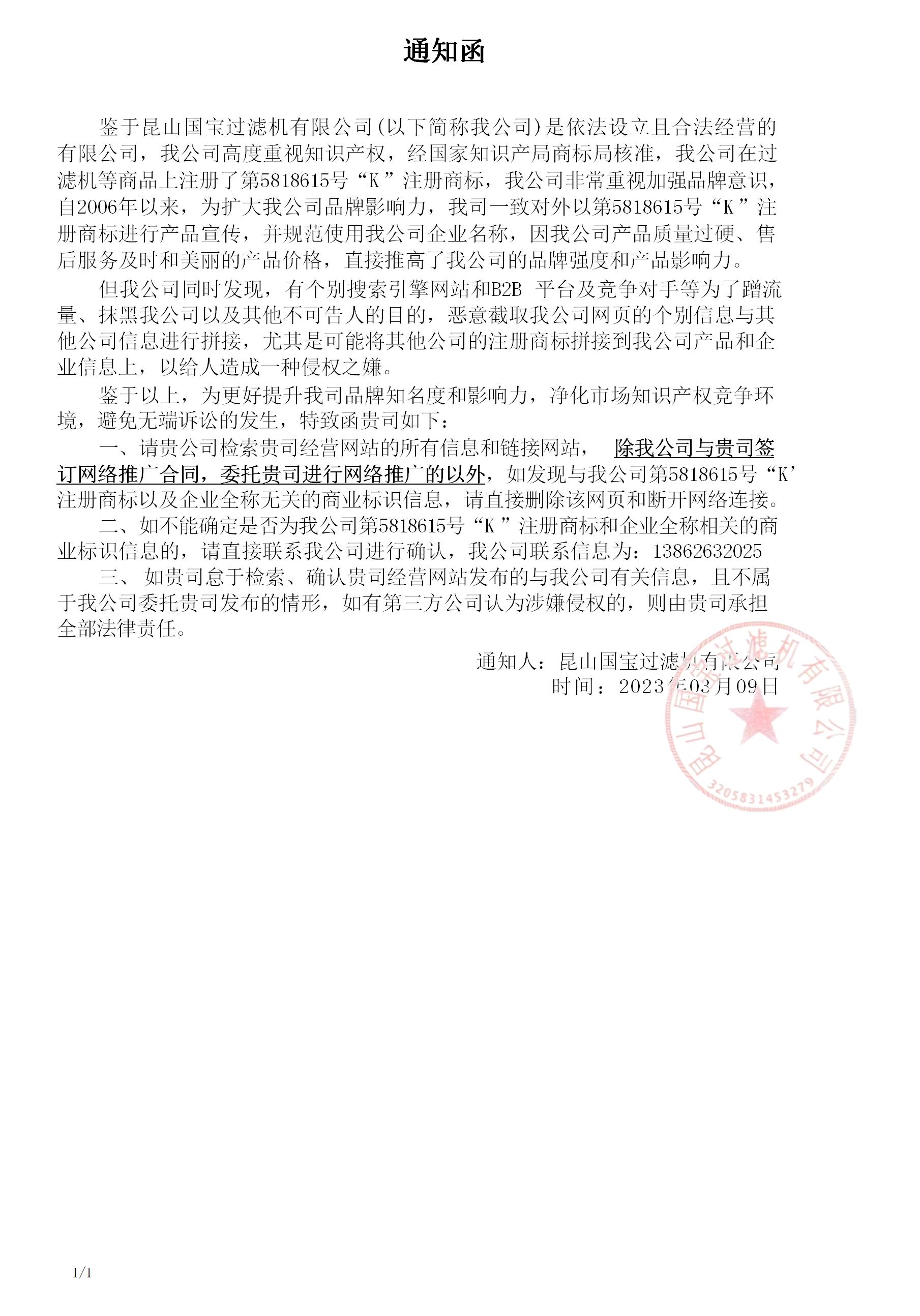鑒于昆山國寶過濾機有限公司(以下簡稱我公司)是依法設立且合法經營的有限公司,我公司高度重視知識產權,經國家知識產局商標局核準,我公司在過濾機等商品上注冊了第5818615號“K”注冊商標,我公司非常重視加強品牌意識,自2006年以來,為擴大我公司品牌影響力,我司一致對外以第5818615號“K”注冊商標進行產品宣傳,并規范使用我公司企業名稱,因我公司產品質量過硬、售后服務及時和美麗的產品價格,直接推高了我公司的品牌強度和產品影響力。